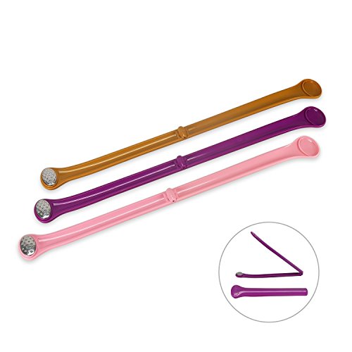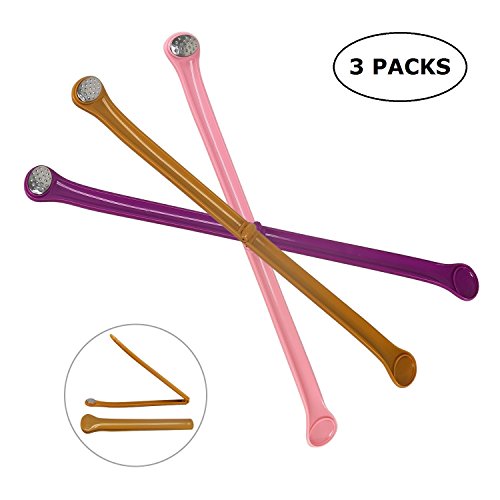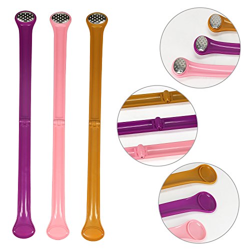 -. Feature : Stainless steel scratch head. / Plastic foldable long handle. / Stylish color: Purple, Pink, Brown. / Comfortable scratch experience. / Item comes with 3 pieces.