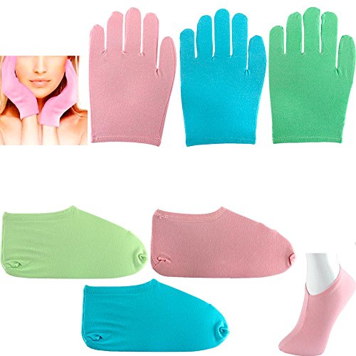 **Available in 3 colors: Blue, Green, Pink. Send us an email after your purchase to choose a color, otherwise colors will be shipped RANDOMLY. Luxurious Home Spa Treatment Moisture Lock Socks and Gloves! This set of 1 pair of socks and 1 pair of gloves is great for keeping your skin healthy and revitalized. These socks and gloves, along with your lotion help dry, overworked feet and hands become noticeably softer again. Providing moisture and nutrients to dry, rough feet and hands. Rejuvenates and soothes lines. Provides anti aging effect. Great for a spa day, manicure/pedicure, traveling or just while sleepiness, this pair is guaranteed to keep your skin glowing. A spa-like experience for your feet and hands in the comfort of your own home!!