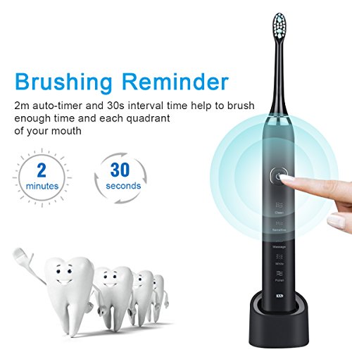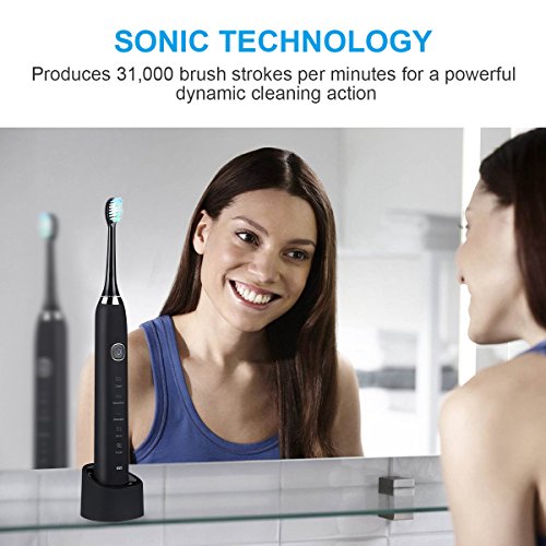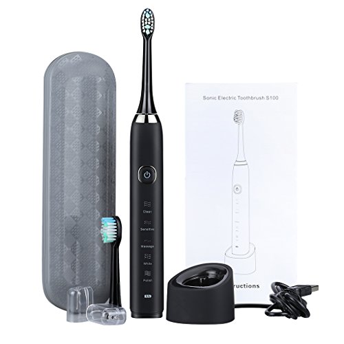 Ovonni Sonic Electric Toothbrush with 2 Replacement Heads, Rechargeable and IPX7 Waterproof Toothbrush with 5 Optional Modes and Travel Case Black