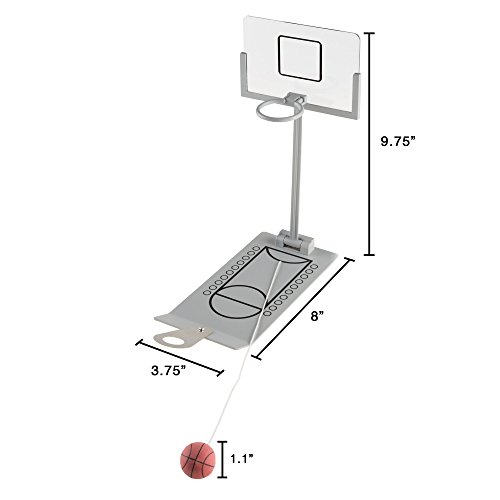 Studio : TMG Publisher : TMG Binding : Toy Product Description The Mini Basketball Arcade Game is a fun and easy to use portable all-in-one game set for basketball fans of all ages. The court is made from sturdy steel, and the ball is attached by secure string so you never have to worry about losing it. The entire game folds up so you can take it with you anywhere. It is perfect for the office executive, playroom, when traveling or even outside. FUN, FOLDABLE, PORTABLE AND EASY TO USE FOR FANS OF ALL AGES - The game unfolds for easy use and transport so you can play it anywhere. Fans of all ages will enjoy this easy-to-play yet difficult-to-master game of chance and skill. NEVER LOSE THE BALL - The rubber basketball is attached to the court by a sturdy string, so you never have to worry about losing it during an air ball or errant shot. Just shoot away until you master the 3-pointer! The ball launcher is moveable to you can challenge yourself by taking shots from different angles. PERFECT FOR THE OFFICE, PLAYROOM OR ANY ROOM IN THE HOUSE - This small yet powerful game is perfect for just about anywhere. Fits perfectly on a desk, in a playroom, and can be played during travel, or even outside. PRODUCT DETAILS - Each basketball game is made of a sturdy steel court measuring 8"x3.75" with a foldable hoop/backboard made of Plexiglas that is 9.75" tall. The basketball launch is a moveable spring loaded metal pad, and the ball measures 1.1" and is secured by a string to the courts so you will never lose the ball. 0