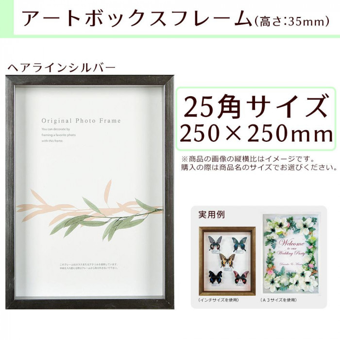 深さ25ミリの立体の木製額。フィギュアBOXとして、フラワーアレンジメントやウェディングボードとしても最適。 製造国:日本 素材・材質:フレーム:木、前面:ガラス 重量:約760g 仕様:規格:25角(内寸:250×250mm) 付属品:紐 ※サプライヤー直送品 ご注文後9~12営業日後の出荷となります【商品名】A.P.J. BOXフレーム アートボックスフレーム(高さ:35mm) 25角サイズ(250×250mm) ヘアラインシルバー 0021768641