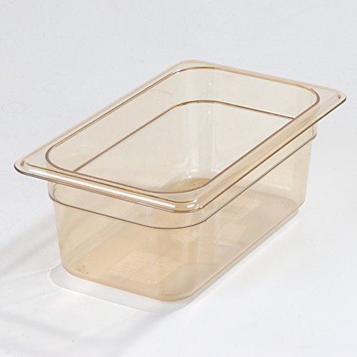 ReleaseDate : 2017-05-15 Studio : Carlisle Publisher : Carlisle Binding : Misc. Product Description The Carlisle 3088113 quarter size, 4" deep, high heat food pan (-40°F to 375°F) is a single solution for cold storage, flash-freezing, microwave preheating and cooking as well as prolonged high temperature retention in steam table applications. Use the amber 2.8 quart pan to assemble, transport and display finished foods and toppings of all temperatures at events and buffet stations. Molded-in capacity indicators (quarts and liters) display measurement and facilitate portion control. A smooth rounded interior makes every scoop count and reduces food waste. The textured exterior edges resist scratching and offer improved handling. The pan is stackable for convenient storage. It is also compatible with Carlisle StorPlus Universal and Smart Lids (sold separately). It is NSF Listed, BPA Free and dishwasher safe. The food pan has overall measurements of 10.25 x 6.38 x 4 inches (L x W x D). 0