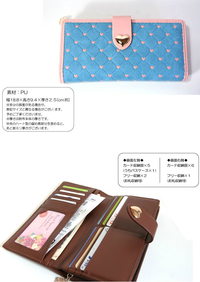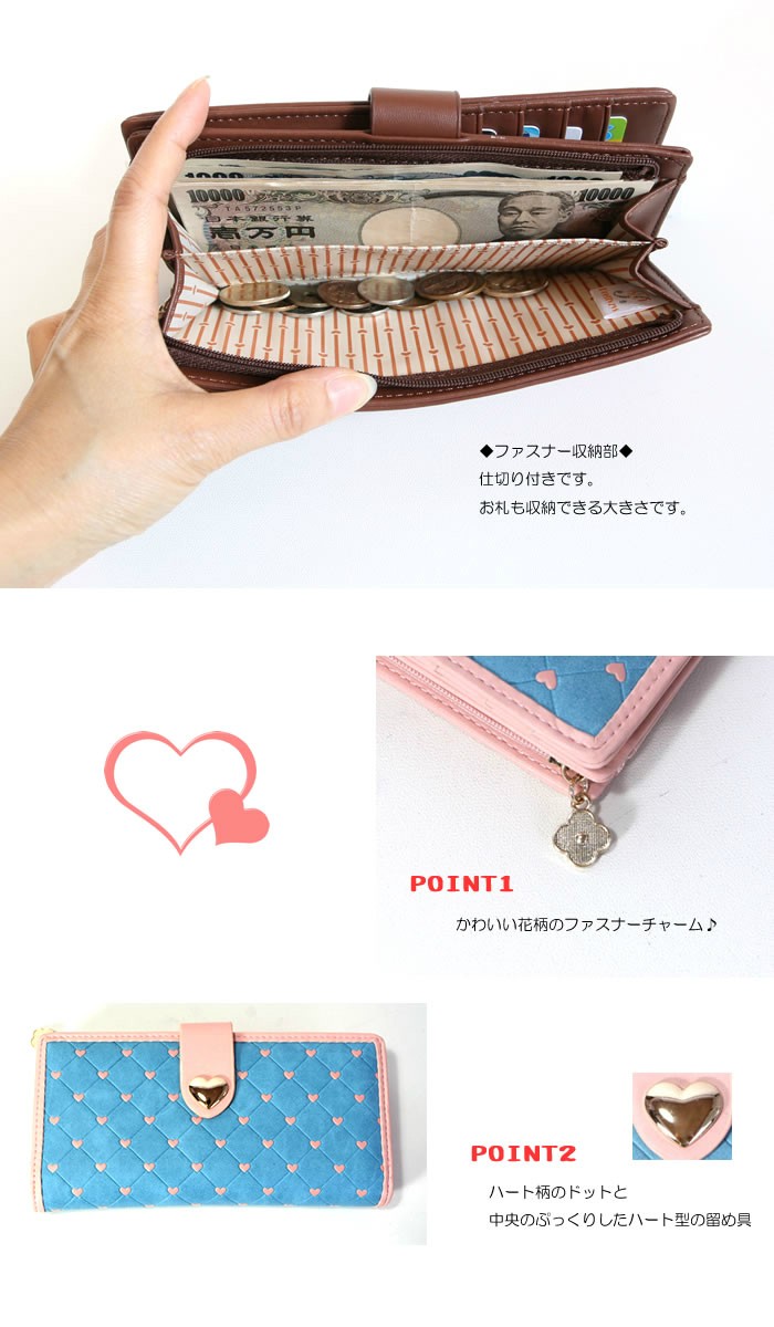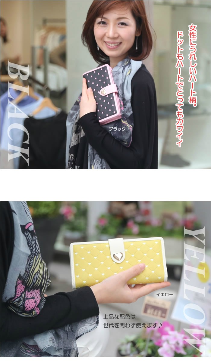 | 特徴 | ・スマホが入る長財布、使い勝手も抜群です。 ・ハートのドット柄が大人女子にピッタリ。自分使いにもプレゼントにも最適♪