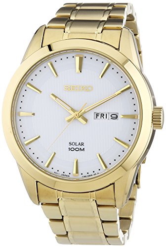 Seiko Solar SNE366P1 Men's Analogue Quartz Steel Strap White Dial Gold Plated