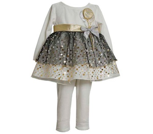 -. Feature : Let your little girl sparkle in this New Year Ballon Pant Set! This outfit is perfect for the New Year. Ivory velour bodice has silver and gold ballon applique at shoulder. Gold bow complements this high waist pant set. It's tiered mesh is complete with stars and gold spangle making this set very festive for the New Year. Matching ivory cotton leggings complete this stunning look.