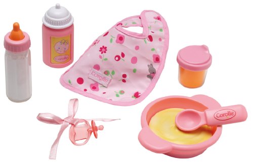 - Feature : Everything a make believe mom needs for her baby doll at mealtime / For a 12" baby doll / Everything little ones need to take care of their baby doll / Playing mommy or daddy will be easy with these accessories / Every Corolle doll is styled in France