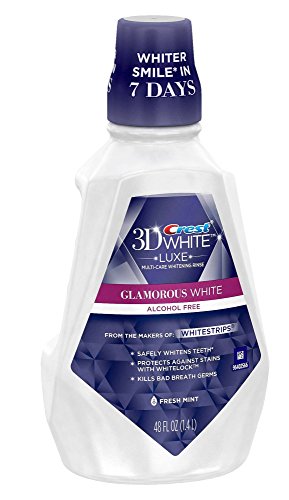 Rinse your way to a glamorous smile. Put the finishing touches on your morning smile routine with Crest 3D White Luxe Glamorous White Whitening Mouthwash. It’s designed with a triple-action formula that whitens teeth, prevents surface stains, and freshens breath. Its exclusive Whitelock Technology acts as a whitening protector that helps prevent new stains from forming. 3D White Luxe Glamorous White whitening mouthwash is enhanced by your full teeth brushing routine. That means, you’ll see a whiter smile in just 2 days if you are rinsing with Crest 3D White Luxe Glamorous White mouthwash and brushing with a 3D White Pro-Flex toothbrush and 3D White Luxe Glamorous White toothpaste together. Combined with the refreshing taste of Fresh Mint, 3D White Luxe Glamorous White mouthwash is the perfect way to stylize your smile.Feature