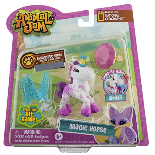 -. Binding : Toy -. Brand : Animal Jam -. EAN : 0681326168355 -. Feature : Collectable animal, accessories and ring / Shine the ring's light on the animal to discover secret patterns and accessorize yourself with it / Customize your animal with accessories and Mix & Match accessories across all animals and pets / Scratch off your code for exclusive content! / Collect them all and Play Wild! -. IsAdultProduct : 0 -. Label : Jazwares Domestic -. Manufacturer : Jazwares Domestic -. Model : 16835 -. MPN : 16835 -. PackageQuantity : 1 -. PartNumber : 16835 -. ProductGroup : Toy -. ProductTypeName : TOYS_AND_GAMES -. Publisher : Jazwares Domestic -. Studio : Jazwares Domestic -. Title : Animal Jam Best Dressed Magic Horse Action Figure -. UPC : 681326168355 -. Warranty : No Warranty