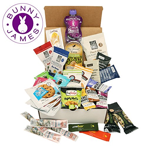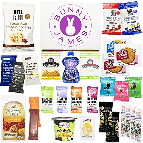 - ORGANIC, SPECIALTY, NON-GMO HEALTHY SNACK GIFT BOX: The Bunny James Fitness care package is the ultimate healthy snack assortment filled with 30 full size high protein healthy nutritious individually wrapped single serve health snacks.