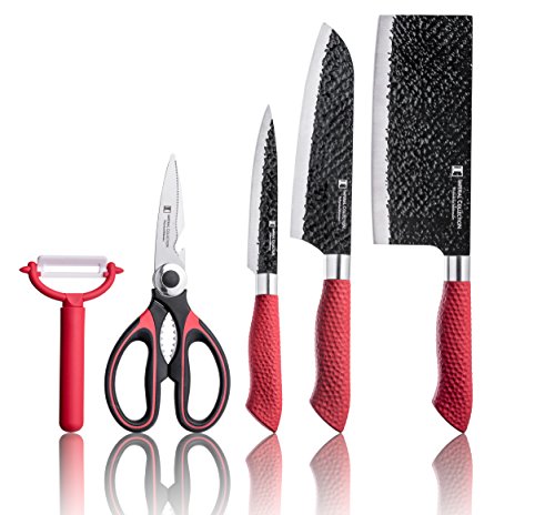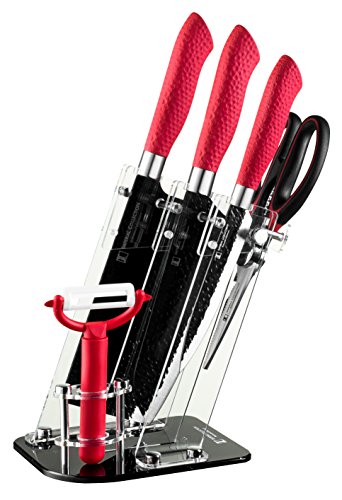 Imperial Collection IM-KST11 RED 6 Piece Knife Set, Includes 2-in-1 Scissor/Bottle Cap Opener, Peeler and Acrylic Stand - Non Stick Coating Kitchen Knives (Red)