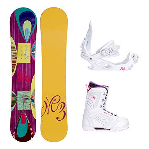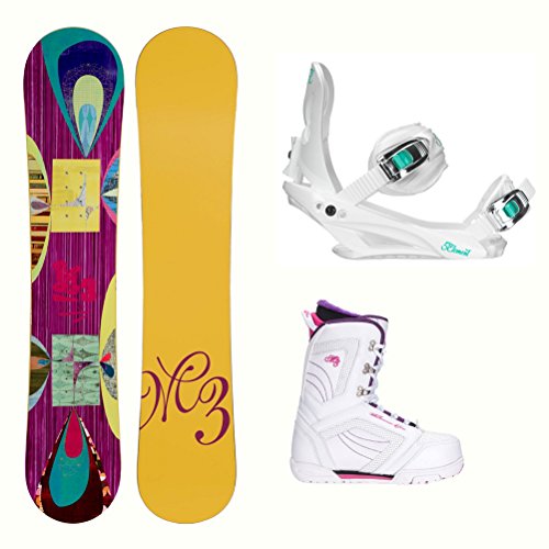 Studio : Millenium 3 Publisher : Millenium 3 Binding : Misc. Product Description Shred the mountain with the Millenium 3 Escape Cosmo Complete Snowboard Package. With EZ Rocker design and ABS Sidewall construction, you get a catch-free ride that has great edge hold. Take this board anywhere and know it's going to be fun to ride and durable because it's equipped with a full poplar wood core and an extruded P-Tex base. And to make it last even longer M3 throws a bi-axial fiberglass laminate in there which consists of stitched, flat fibers at 0 and 45 degrees along the length of the board and is sandwiched between the core and top sheet.The value driven 5th Element Layla binding is included. The Layla from 5th Element is a great economical binding for the newer or less experienced snowboarder who is looking for performance and value. The convertible toe straps will keep your foot locked down, give you great control over your board, and will conform to any boot toe shape. The Layla has a padded base plate to reduce vibrations as you learn to progress and pick up speed.Rounding out this package is the Millenium 3 Cosmo boot. Designed with comfort in mind, they feature a traditional lacing style with an EZ Speed liner lacing system that locks the liner securely around your foot and holds your heel in place. The warm and cozy liner also has a plush cuff and neoprene flex panel for added all day riding comfort. The metal lacing eyelets lock laces in place so you spend less time adjusting your boots and more time practicing those skills. Snowboard Best Use: All-Mountain Freestyle, Snowboard Rocker Profile: Camber, Package Type: Board, Boots, and Bindings, Gender: Womens, Product ID: 424365 0