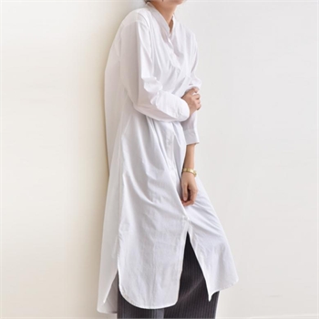 차이나 넥 디자인과 오픈 클로징은 프론트 중앙에 있는 단추 디테일로 간편하게~ 소매 끝단의 단추 마감 디테일로 깔끔하고 심플한 코디가 가능하답니다:)