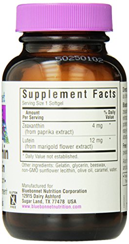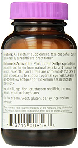 ReleaseDate : 2015-05-28 Studio : BlueBonnet Publisher : BlueBonnet Binding : Health and Beauty Product Description Bluebonnet's Zeaxanthin Plus Lutein Softgels provide pure zeaxanthin and lutein from natural paprika and marigold flower extracts. Zeaxanthin and lutein are carotenoids that serve as potent antioxidants to support optimal eye health. Available in easy-to-swallow softgels for maximum assimilation and absorption. 0