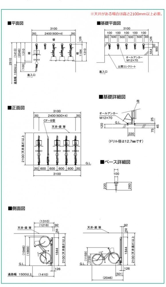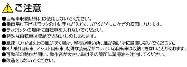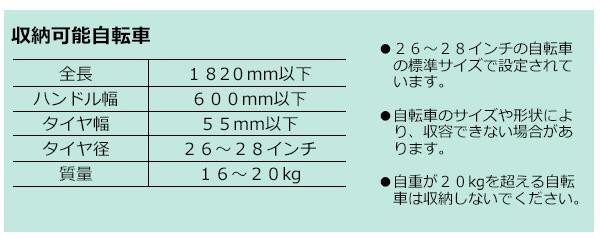 | 仕様 | 組立品 【収納可能自転車】 全長:1820mm以下 ハンドル幅:600mm以下 タイヤ幅:55mm以下 タイヤ径:26~28インチ 質量:16~20kg 【ラックピッチ】 600mm |