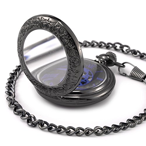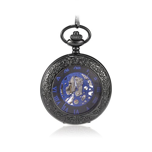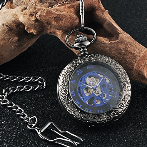 JPC 회중 시계 포켓 워치 기계식 태엽 양면 스켈리턴 문자판 블루 로마숫자 앤틱풍 체인 첨부 와 목걸이 펜던트 기프트 상부속 선물용
