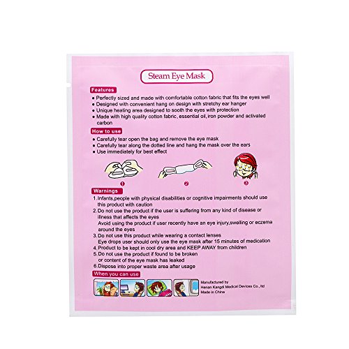 What is steam eye mask? Simply,steam eye mask is an eye mask thatcan activate blood circulation around the eyes and relieveeye strain and fatigue. The effect of Steam Eye Mask: AuthenticEssence Oil Steam Eye Mask Soothing the Nerves and Aiding Sleep Dilute the Dark Circles Relieves Eye Strain and Fatigue Rose Essence Oil Eye Mask Flavorof rose steam comforts your eyes. Top Five Functions: 1.Dilute the Dark Circles:Dilute the dark circles for long use. 2.Relieves Eye Strain and Fatigue;Hot compress to relieves eye strain and fatigue. 3.Moist Eyes:Eye mask releases steam to make your eyes moisturizing. 4.Soothing the Nerves and Aiding Sleep:Soft, warm material aids sleeping. 5.Clean cosmetic residual:Warm steam accelerates the flushing out of toxin. Precautions: 1. Pls. do not use when eyes have the disease, inflammation, or scratches, swelling around the eyes, eczema and other abnormal circumstances. 2. Because of individual differences in skin sensitivity, if the temperature is too high or you feel uncomfortable, stop using it immediately. 3. It will produce hot steam in the process, so there may cause the makeup to disappear. 4. If you have used the eye drops, please wait a moment before using this product. 5. Each piece can only be used once, do not reuse. 0