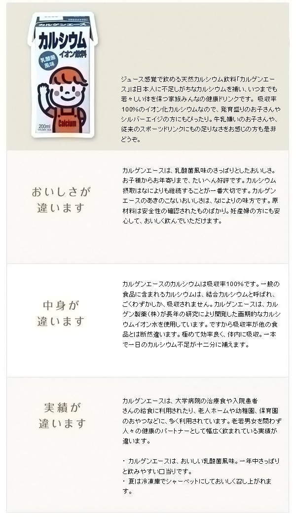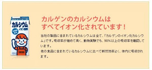 日本人が一番不足している栄養素である「カルシウム」を美味しく、継続的に摂取できる健康飲料。吸収率の極めて高い「イオン化カルシウム」を150mg含有。1日1本で不足を十分補うことができます。乳酸菌風味は、子供からお年寄りまで「サッパリとしていて美味しい」と好評です。1982年に我が国で初めてのカルシウムイオン飲料として発売されて以来、病院関係でも入院患者の給食などにお使いいただいています。 |