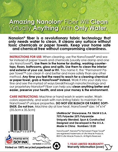 NANOLON® FIBER IS A PROVEN BREAKTHROUGH CLOTH TECHNOLOGY that is uniquely blended, spun and constructed into the greatest towel ever! It captures liquid, dust, dirt and grime like a magnet, and without toxic chemicals. You can use it to clean and dry virtually any surface without paper towels and without toxic chemicals. When it becomes dirty, you just wash it and use it again. CAN EVEN TAKE THE PLACE OF SPONGES because of their amazing absorbency. This is NOT old, common microfiber cloth. Nanolon® is a new, next generation fiber PROVEN in laboratory testing to clean numerous surfaces as well or better than chemical cleaners and paper towels using only water.