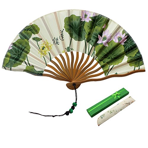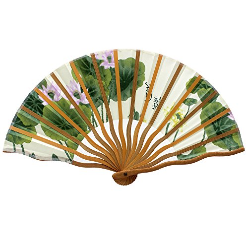 Jsswb Mini Handmade White Silk Folding Fan with Green Lotus Leaf