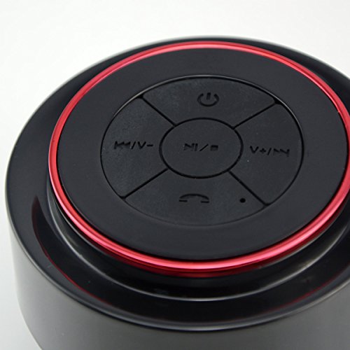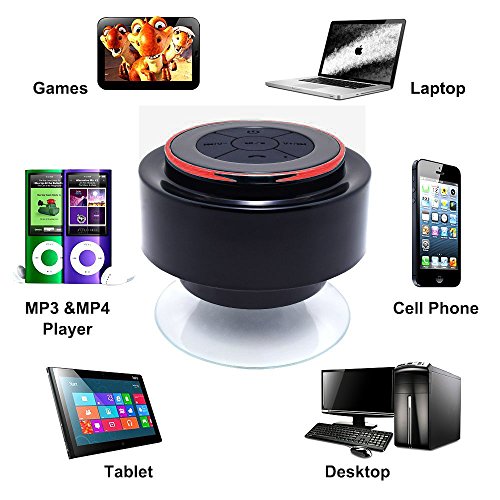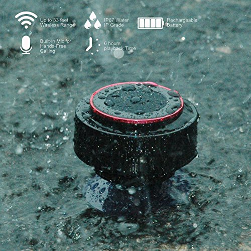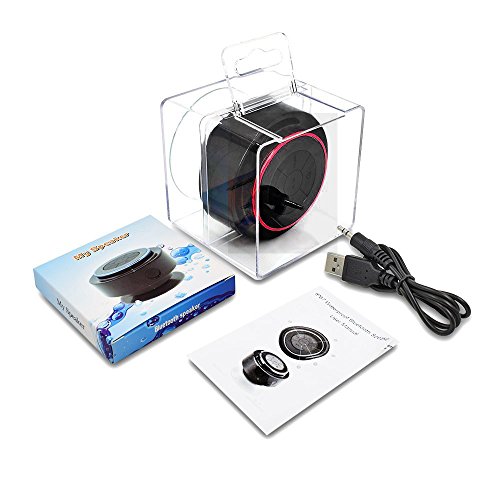 -. Feature : Completely Waterproof: This bluetooth shower speaker has an IP67 rating, not just splashproof or water resistant, but is Shockproof, Dustproof and Damage Resistant. This means you can fully submerse it under water up to a depth of 3ft. We have achieved the CE, FCC and ROHS certifications. / High Quality Sound: This speaker has superb volume levels for a rich stereo sound in crisp high definition (Hi Def). Supplies studio quality at home, office, indoor & outdoor with a deep bass. New powerful sub woofer & loud crystal clear sound from a small circle. It runs on just 3 watts of power, but it delivers the booming sound you'd expect from a boombox. / Simple Bluetooth Pairing: Connect your Smartphone, tablet, computer etc. via Bluetooth in less than 6 seconds. Mini lightweight and ultra- portable design, making it better than any shower head system. Great for the bathroom, showers, pool, boat, beach, kayak, patio or anywhere else. / Easy Control: Easily adjust the volume, play and pause, skip songs forward and back, All controls are easily identified and accessible on the front of the device. It also acts as a Handsfree Speakerphone with a built-in mic for calling, you can answer a call hands free if needed by using the Touch Buttons on the speaker. / Incredible Battery Life: This shower speaker lasts for up to 10 hours playing time between charges. Plug it into the adapter, and it's fully charged again in under 3 hours! Battery can keeps its charge for weeks due to the increased capacity of the chargeable battery for long hours playing time.