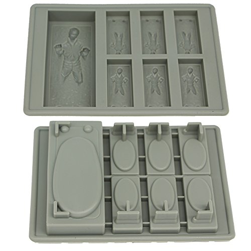 STYLE---These molds produce figures in the shape of various characters from the Star Wars saga. You can mold Darth Vader, Stormtroopers, X-wing fighters, the Millennium Falcon, R2D2, Yoda, and even Han Solo in ice, candy or chocolate!