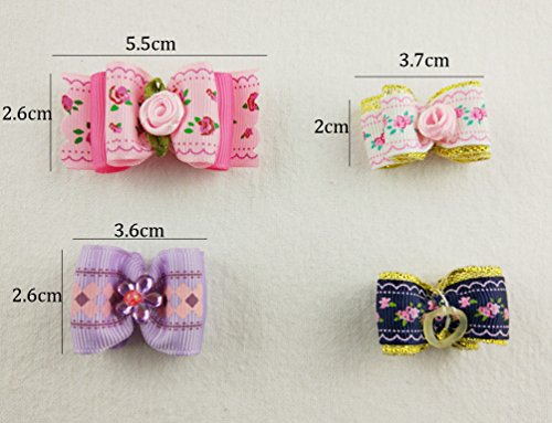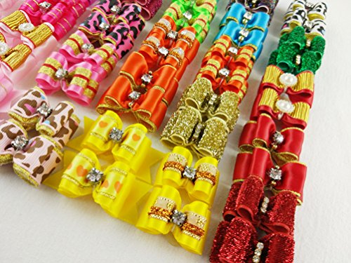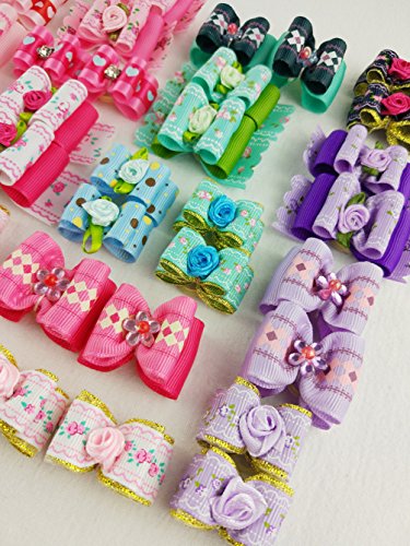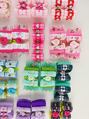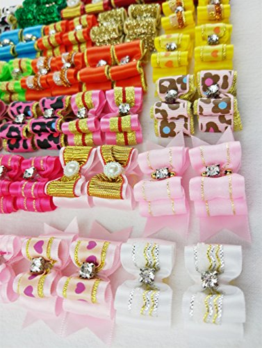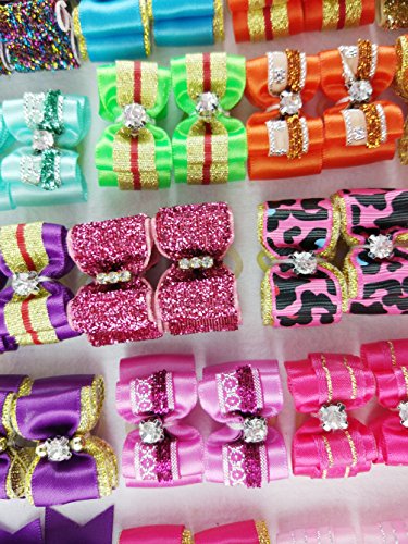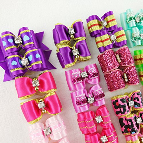 -. Feature : Size: about 2.5-3.5cmx1.5-2.5cm,backside with rubber bands / Material:rhinestone,ribbon,rubber bands / Handcrafted very well made pet accessory / Pack of 24pcs/12pairs cute hair bows, mixed all colors and patterns in random / Perfect for Holidays Party, Designed to dress your pets such as dogs,puppies and cats,It can make your pet look more fashionable and attractive.