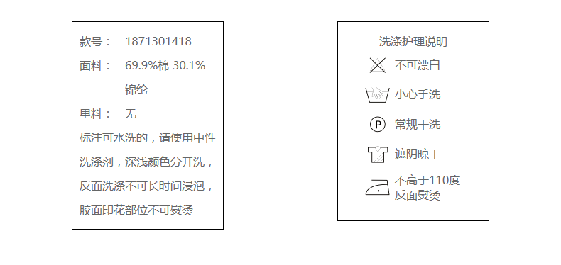 * 请不要使用漂白剂及长时间浸泡,清洗后,调整衣型进行晾晒,避免阳光直晒,以免出现变色情况.