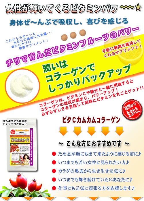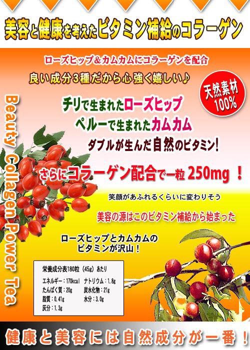 ビタCカムカムコラーゲン!≪美容ビタミンサプリメント≫ ローズヒップ&カムカムにコラーゲンを配合 ・・おすすめ商品特徴・・・・・ チリで生まれたローズヒップ・ぺルーで生まれたカムカム・ダブルが生んだ自然のビタミン! さらにコラーゲン配合で一粒250mg! ビタミン豊富な人気のローズヒップ。オレンジの30倍、アセロラの2倍のビタミンCと言われるカムカムをドッキングさせ、さらに嬉し いコラーゲンも配合した最高のビタミンのサプリメントになりました。 女性に嬉しい自然ビタミンを多く含むこのサプリメントを毎日の美容健康の補助食品としてお召上がり下さい、活き活きとした健康的な美容の応援をしてくれるでしょう。女性に大切なビタミン が、ス~ッと浸透し、喜びを迎えてくれる簡単サプリメントとしてご活用下さい。 潤いは コラーゲンで しっかりバックアップ コラーゲンは、ビタミンCや鉄分と一緒に摂取すると コラーゲンの吸収が高まり、パワーアップ! みずみずしさを目指して同時にビタミンを丸ごとゲット!! ~ こんな方におすすめです ~ ● ため息が顔にも出て来たように感じる前に♪ ● いつまでも若い女性に見られたい方♪ ● カラダの奥底から生き生き元気に♪ ● いつまでも輝き続けていたいあなたに♪ ● 仕事にも元気に頑張る方を応援します♪ ・・サプリメント(錠剤)・・ 一日6粒を目安にお食事の後などに、1~2回程に分け、お水かぬるま湯等でお召し上がり下さい。いつでもどこでも、お手軽な簡単サプリメントで美容のビタミンを補給!飲み物片手にいつでもOK。 新鮮原料をそのまま粉末、飲みやすい錠剤タイプにしていますので、自然の美容パワーを簡単に取り入れる事が出来ます。 また、他の色々な野菜サプリメントと一緒に飲まれるとより一層のパワーと、毎日の健康維持に良いでしょう。 ・・内容(原材料)・・・・ 森のこかげの健康サプリメントシリーズは、自然原料をベースに新鮮100%をそのまま使用した乾燥の健康サプリです。 ・・備考・・・・・・・・・ 保存方法:開封前 直射日光、高温多湿を避ける。 開封後密封して、低湿度または、冷蔵庫などの冷暗所にて保存して下さい。 | |