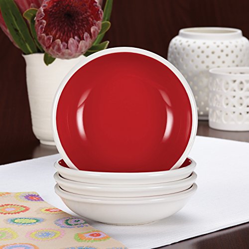 Sized and shaped for the ideal single-person serving of fruit, relishes and more, the Rachael Ray Dinnerware Rise 4-Piece Stoneware Fruit Bowl Set brings eye-catching shape, style and two-tone hues to the table. These 7-1/2-ounce fruit bowls are the perfect size for serving fresh berries and conveniently hold a half grapefruit or avocado. Grab a bunch of them to set out individual portions of Rachael's Garlicky Holy Guacamole at a casual dinner for friends and family. They're crafted from durable stoneware that is non-reactive to foods and hold heat well. The plates are safe for use in the microwave, making it easy to heat up an afternoon snack. They're also dishwasher safe, so cleanup is a snap. With its vibrant color, this fruit bowl set coordinates with many other pieces from other Rachael Ray collections. Serve family and friends refreshing fruit dishes in the stylish Rachael Ray Dinnerware Flair 4-Piece Stoneware Fruit Bowl Set.Feature