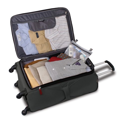 -. Feature : Jacquard weave polyester construction for superior strength / Two exterior pockets, organizational interior pockets / Telescoping wand, top and side handles / Spinner wheel system / Dimensions: 20" H x 10.5" W x 14.25" L - 5.7 lb