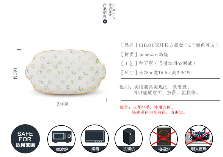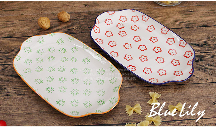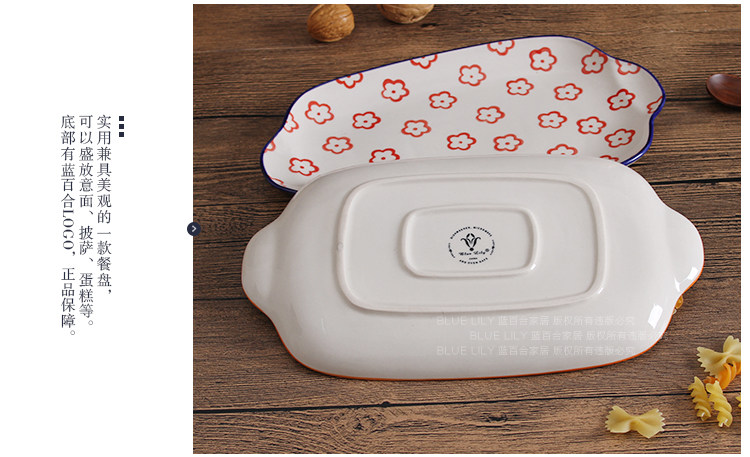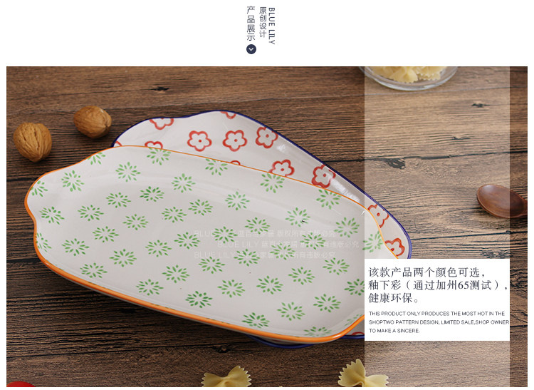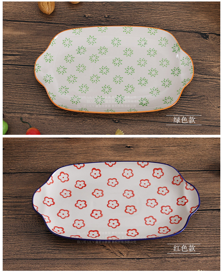 出口纯手工釉下彩11寸双耳餐盘 鱼盘深盘长方平盘家用炒菜点心盘