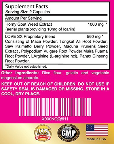- Feature : Love SX is an ultra potent female libido booster and enhancer. It's scientifically developed formula has been used by thousands of women to renew their spark in their romance. / Are you ready for more compliments from your partner? Each Serving Contains 1000 mg of Horny Goat Weed. Made of the ingredients that help support intimacy and a healthier libido. / Ready to have an amazing wild time? Love SX is an active libido enhancement supplement for women and works with your body to create faster full body arousal, causing enhanced sensitivity through improved blood flow. / Ready for the ULTIMATE ORGASM? Promotes heightened sexual anticipation and with regular use may result in more intense and pleasurable orgasms. 100% Pure, Natural, Effective and safe! / 100% Satisfaction Guarantee!! Made in the USA. What are you waiting for?