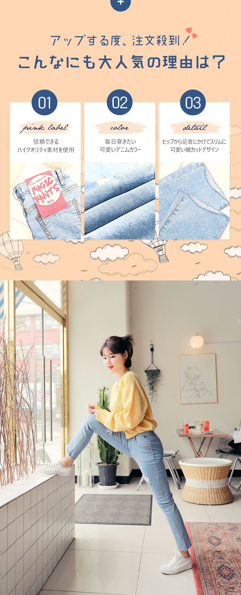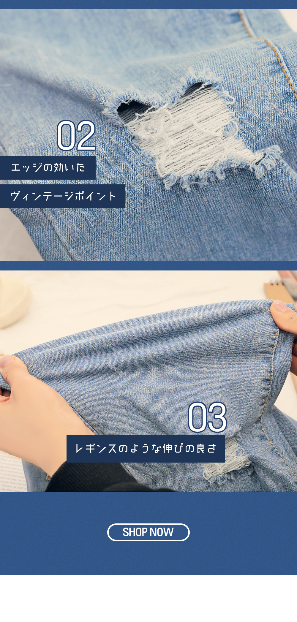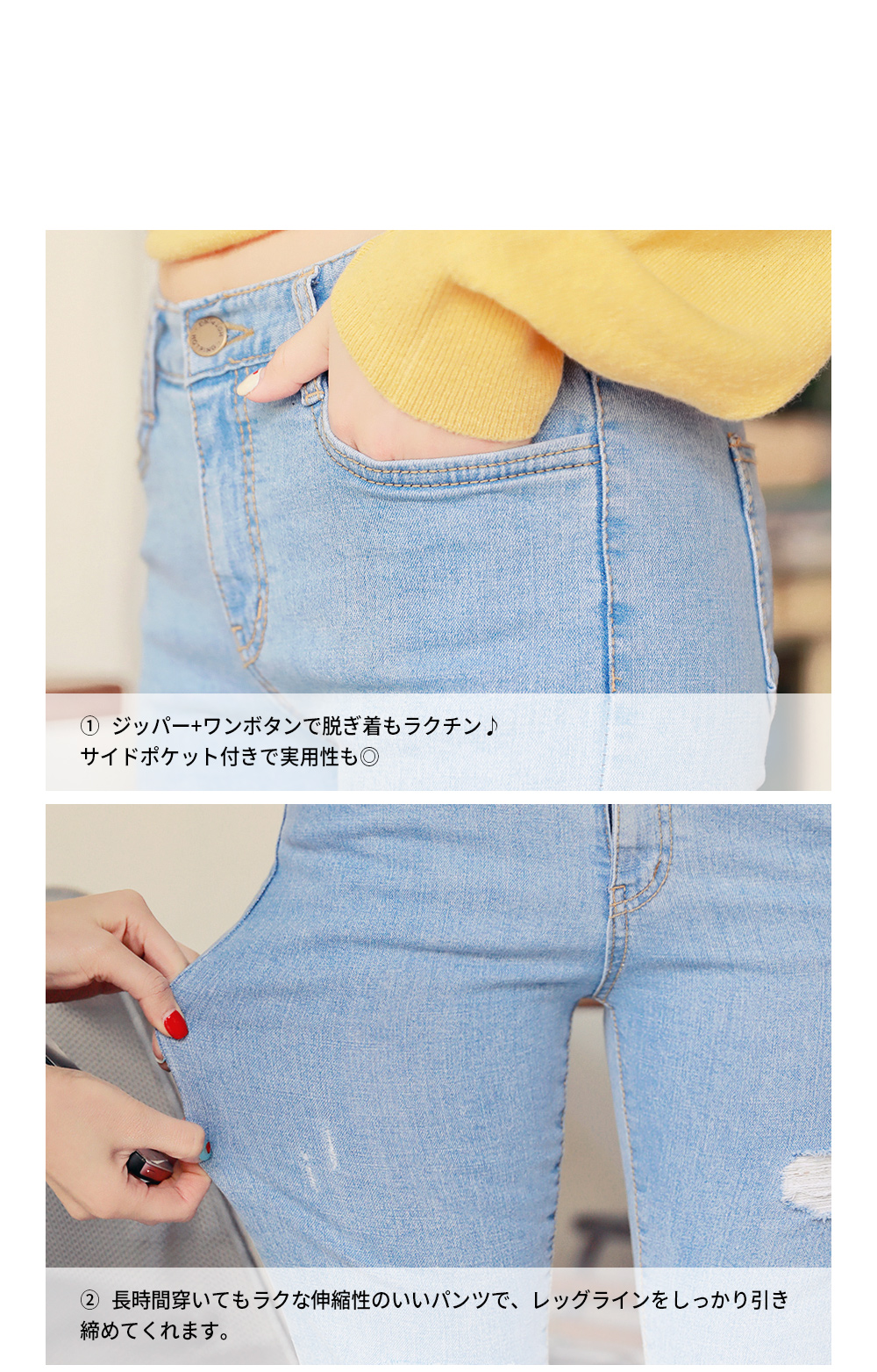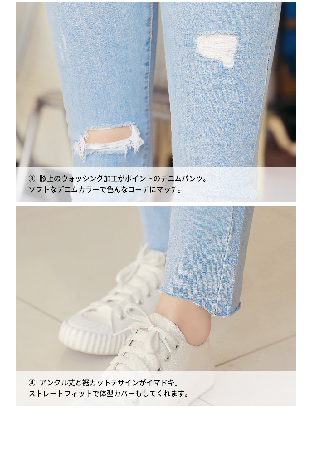 ソフトなデニムカラーで春にぴったり◎膝上のダメージ加工でスタイリッシュに楽しめます!伸縮性に優れた素材で穿き心地バツグン!余裕のあるストレートフィットで体型カバーもしてくれます♡トレンドのアンクル丈にカッティング加工をプラスし、イマドキなオシャレを楽しめるデニムパンツです★