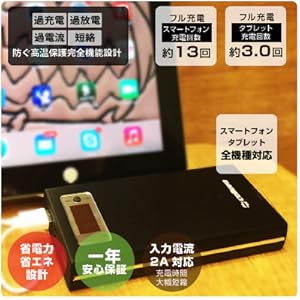 5V充電電圧対応の端末であれば、90%以上対応可能。スマートフォン充電回数約13回、タブレット充電回数約3回、本体が充電完了後自動的に停止し、過剰充電を防ぐ。モバイル機器への充電完了後自動的に停止し、過剰充電を防ぎ、端末が必要な電力のみ提供し、大切な端末を守る設計。スマートで省電力、省エネ設計なので一年間、未使用でも残存容量は約90% 。