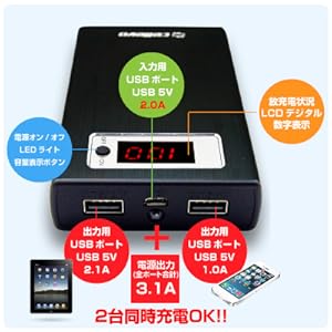 USBポートx2、出力5V/2.1A+5V/1A(同時2.1A+1A)、microUSBx1、入力5V/1-2A