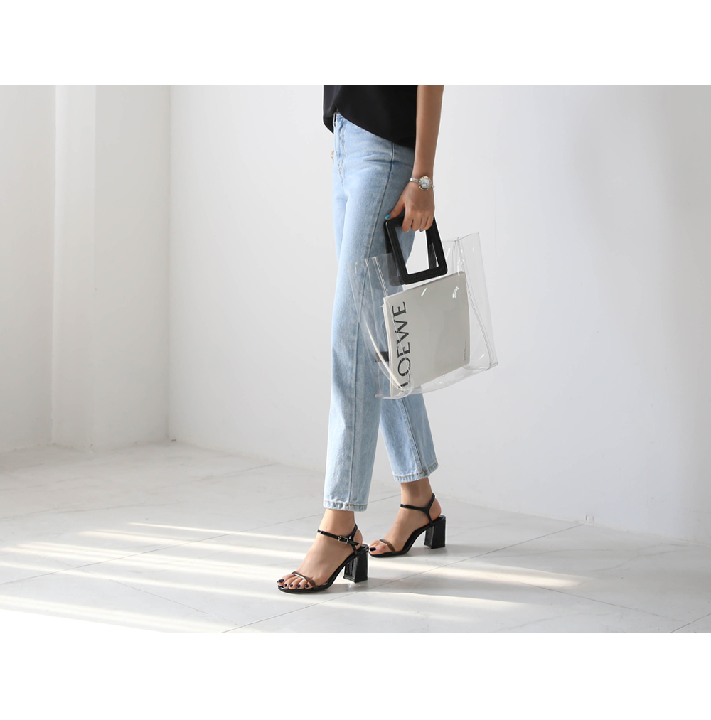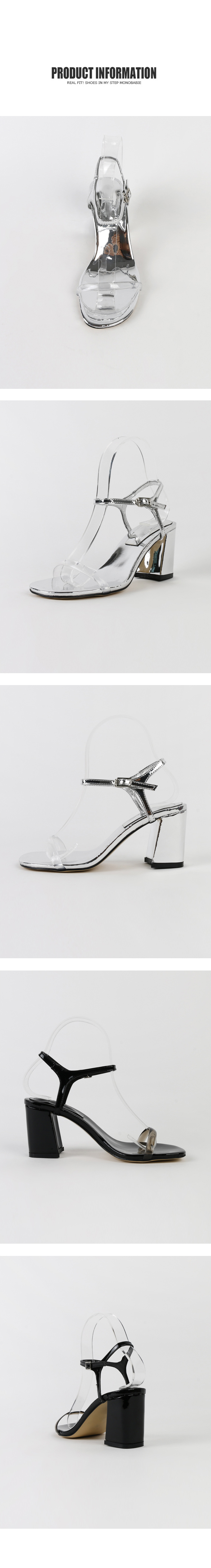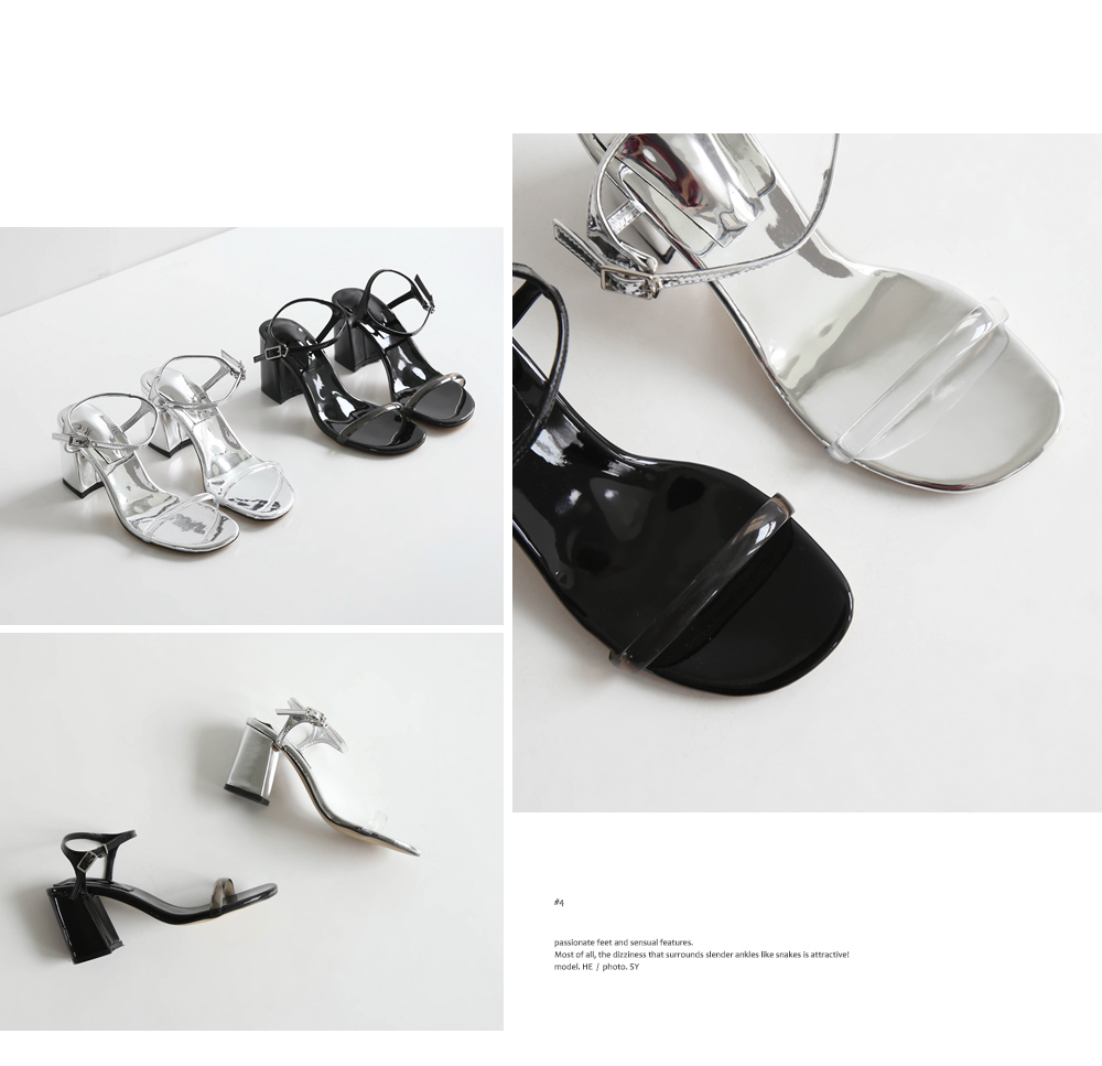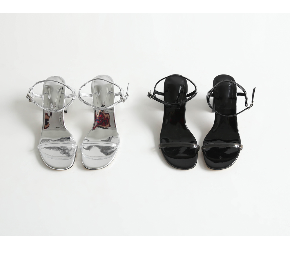 에나멜과 PVC 소재로 이루어진 미들굽 샌들입니다.