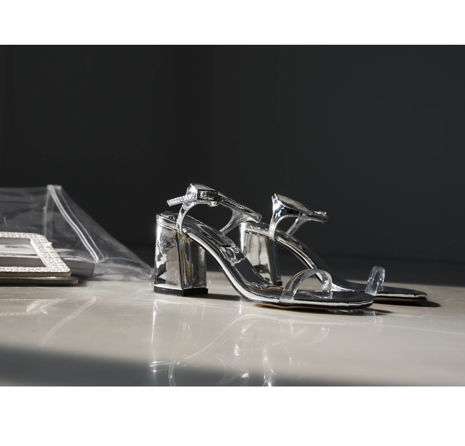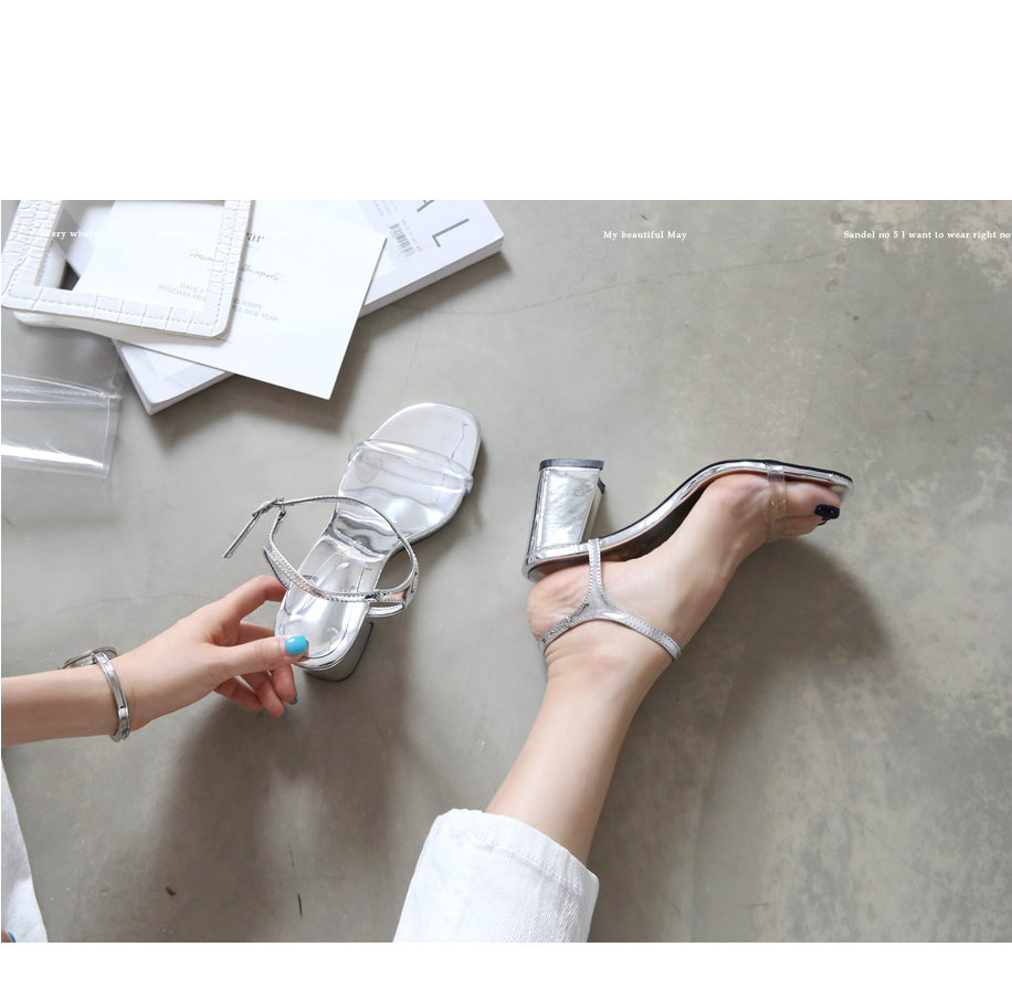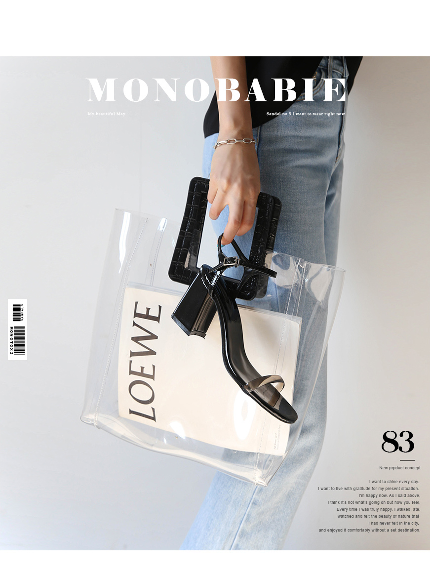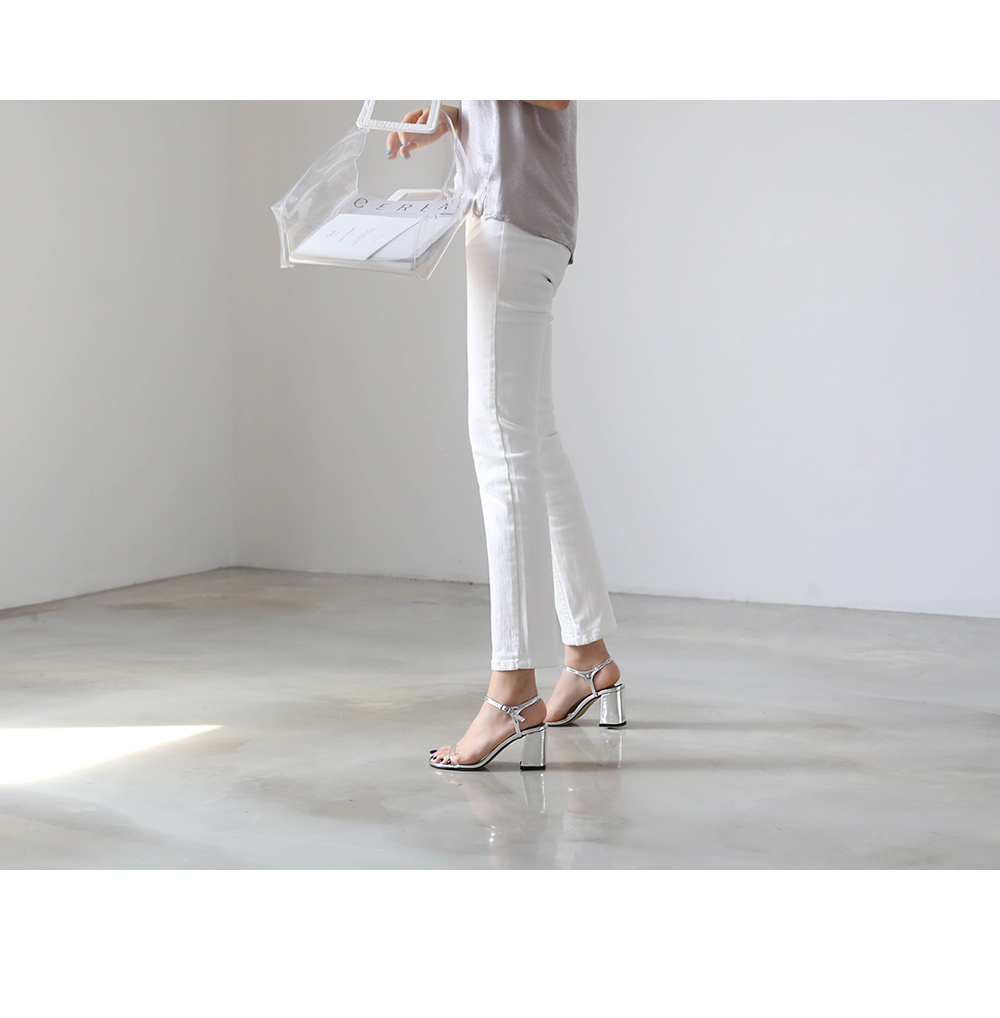 에나멜과 PVC 소재로 이루어진 미들굽 샌들입니다.