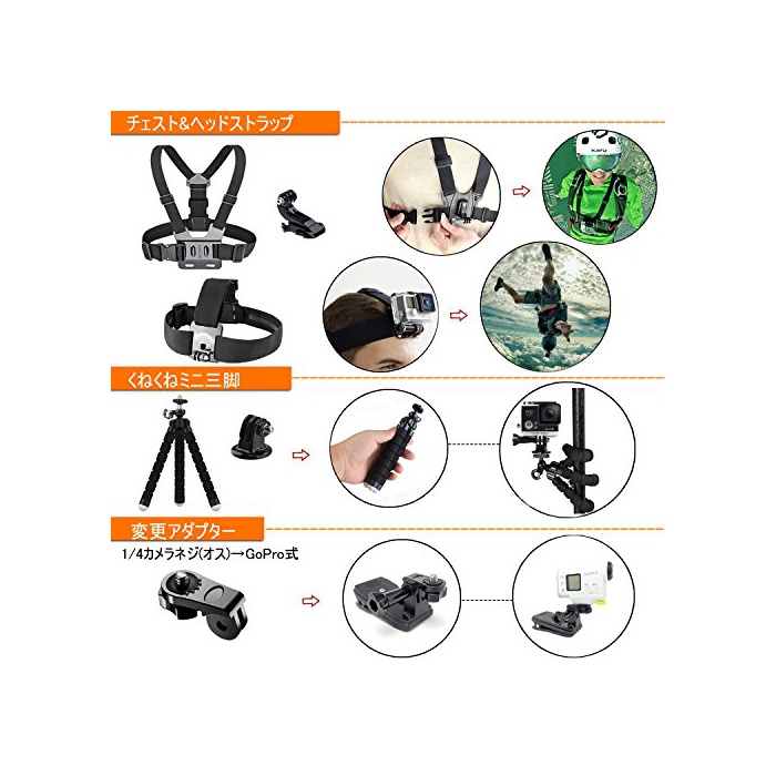 【대응 기종】:GoPro HERO6 Black HERO5 Black Sliver HERO Session Go Pro HERO4/3+/3/2 HERO+LED SJCAM SJ7/6/5/4 MUSON AKASO EK7000 DBPOWER APEMAN A66 Victure 등의 액션 카메라에 대응.「변경 어댑터1/4카메라 나사(수컷)→GoPro식」도 부속 를 위해,Xiaomi,Yi 등도 이 키트가 이용 가능 입니다.