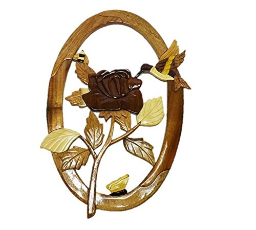 Handmade Art Intarsia Wooden Wall Plaque - Rose W/humming Bird(033)