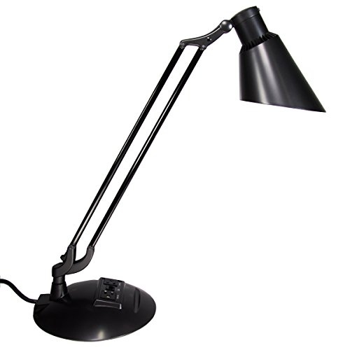 -. Feature : Ergonomic, eco-friendly, convenient / Base has 2 grounded outlets & CAT5 web data port, Matte black 90% recycled plastic, weighted base, Plastic reflector shade cuts glare & stays cool / Adjustable 360° rotational & 140° vertical shade: 100% recycled aluminum / E26 socket uses standard bulbs (not included), 18W, 3500K color temperature, Made in China / 25"H x 6"D shade x 9"D base, 8ft cord