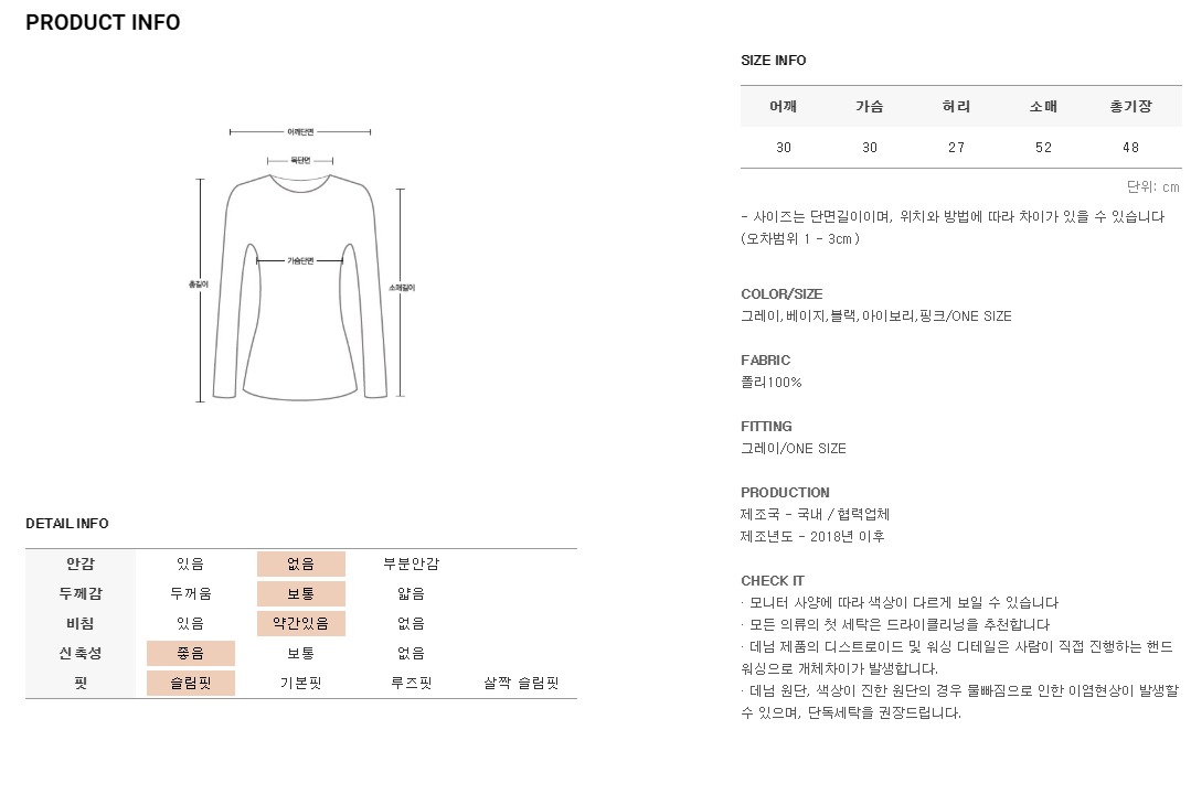 폴리혼방의 골지원단으로 볼륨감있는 바디라인을 연출해주고