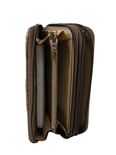 Product Description Measures 7 1/2 inches by approximately 4 inches. There are 2 separate zipper compartments.? One side opens to 12 credit cards slots, an additional zipper pouch, and 4 large slip pockets for money. The other side opens to a large compartment for change. Tag Information: Style No.:? BB509257 Name: Ware SLG Color: Mocha 0