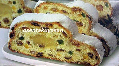 原材料名:レーズン、小麦粉、バター、砂糖、アーモンド、ブドウ糖、オレンジピール、レモンピール、バターファット、酵母、転化糖、食塩、へーゼルナッツ、卵、香辛料、安定剤(D-ソルビートル)、香料、乳化剤、増粘剤(グァーガム)
