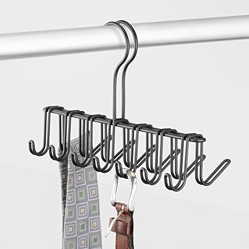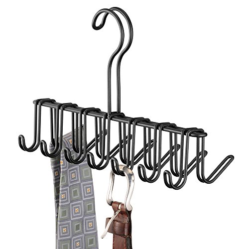 -. Feature : Tie and Belt Hanger for over-the-rod closet storage - 14 hooks organize your accessories! / Also stores and organizes handbags, purses, scarves, necklaces, bracelets, and other jewelry and accessories / Easily hangs over closet rod - No hardware required / Made of durable steel with matte black finish / 10.25" x 3.75" x 6.75"