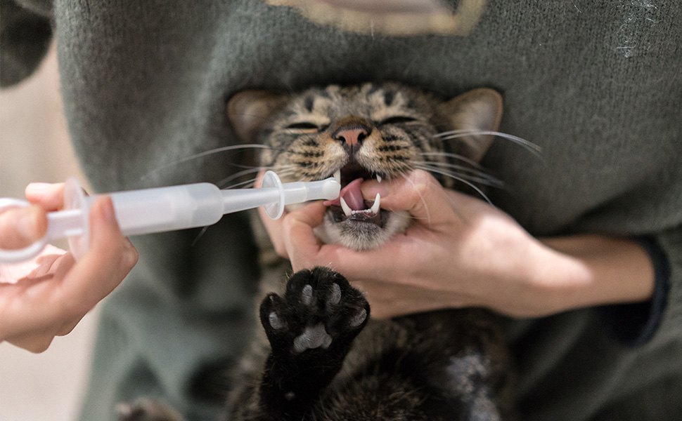 一つの手でペットを抱き、違う手で薬を与える。薬を与える時の悩みを飛ばす。