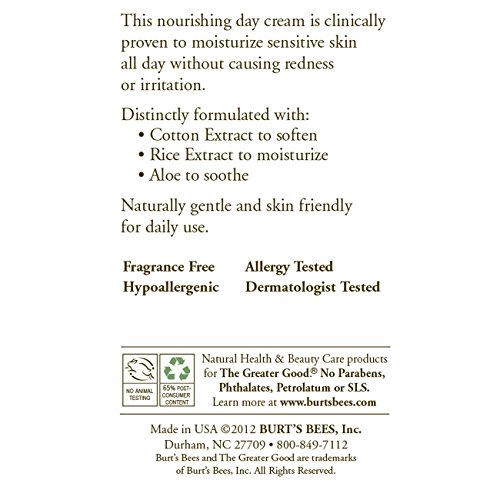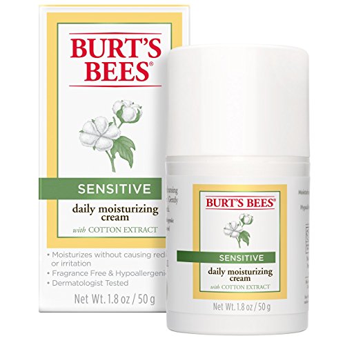 Clinically shown to moisturize sensitive skin all day without causing redness or irritation, Burt's Bees Sensitive Daily Moisturizing Cream provides soothing natural skin care for sensitive skin. Rice extract and aloe moisturize and soothe your sensitive skin, while cotton extract helps replenish your skin's outer layer and protect it from potential irritants. Lightly smooth this natural face moisturizer over your face and neck after cleansing as part of your skin care routine. It is a naturally gentle way to keep even very sensitive skin feeling fresh and well hydrated.Feature