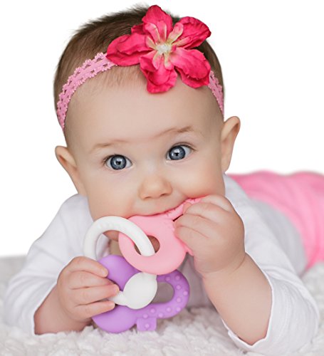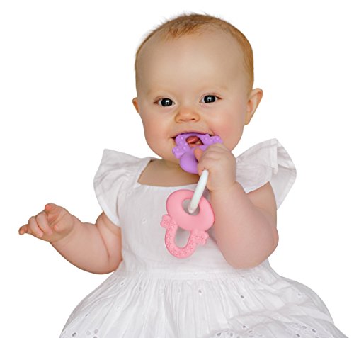 -. Feature : 2 keys on a ring in an attractive gift bag with tag. Perfect for little hands. Keep it in the car, the diaper bag, or next to the changing pad to soothe your baby. / 100% Food-Grade Silicone. 1-piece design with no detachable parts makes it baby safe. 4.5"L x 3"W x 1.5"H. Odorless and tasteless. Non-porous surface doesn't harbor bacteria. / BPA-Free, PVC-Free, vinyl-free, phthalate-free, rubber-free, latex-free, lead-free; no plastic, nitrosamines, cadmium, or heavy metals! Certified CSPC, EN71, MSDS, LFGB, AS/NZS, and FDA. / Multi-sensory, early developmental toy. Textured teething surfaces massage and soothe gums, stimulate healthy teeth eruption, and provide pain relief for both front teeth and molars. Soft and chewy. / Freezer and dishwasher safe (top rack only). Refrigerate to safely cool baby's swollen gums. Hypoallergenic and waterproof makes for the perfect bath toy. No holes to collect water or drool.