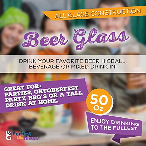 SUPER SIZE YOUR PARTIES AND BRING FUN AND EXCITEMENT TO ANY PARTY. Super size your next BBQ, game day party, or get together with this fun, giant jumbo sized beer glass to drink your favorite beer, highball, beverage or mixed drink in. HOLD 50 OZ OR OVER 4 CANS OF YOUR FAVORITE BEER, SODA OR BEVERAGE. Easily holds over 4 cans (12 Oz cans) of beer, soda or beverage drink. GREAT FOR PARTIES, BBQ'S, OKTOBERFEST, OR A TALL DRINK AT HOME. Create excitement, fun and be the talk of everyone at your next party, oktoberfest party, or social event with this cool vintage elegant jumbo giant bar drink glass drinking dispenser instead of a beer mug and enjoy drinking to the fullest. Or just grab a tall cold drink or your favorite beverage after a long day of hard work. ALL GLASS CONSTRUCTION. Hand wash with soap and water. Do not put in dishwasher as it made of glass and may break. MEASURES 11.5 INCHES TALL. Size 11.5 inches tall , 3.5 inches diameter at top and 3.75 inches diameter at base. 0 |