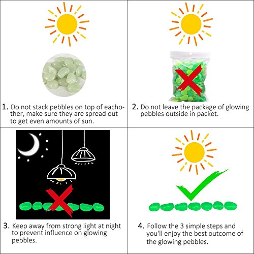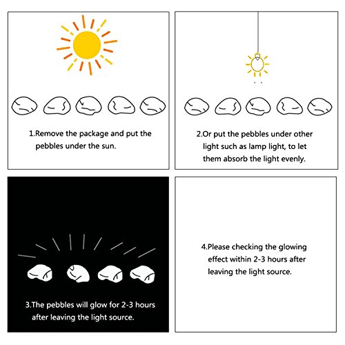 - ➤ECO-FRIENDLY – No electricity needed! These glow pebbles absorb and store energy from sunlight or other light sources and light up in dark environments. Made of premium resin-durable, non-toxic & tasteless and non-radioactive. Fine workmanship and polish so there is no sharp edge.