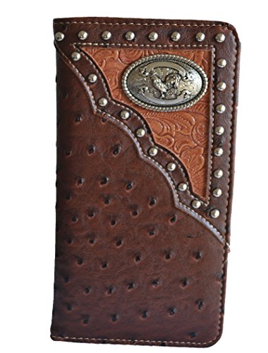-. Binding : Apparel -. Brand : Stony West -. Department : mens -. Feature : animal ostrich P.R.Int pu leather long men wallet / 6 Credit card slots and 2 compartments, / Clear ID Holder, Size 7" X 3.75", floral embossed trim / Removable Check book cover / Front floral embossed trim accented with silver tone rooster concho and studs -. PackageQuantity : 1 -. ProductGroup : Apparel -. ProductTypeName : ACCESSORY -. Size : Small -. Title : men brown black rooster chicken long tall checkbook wallet